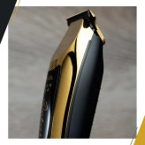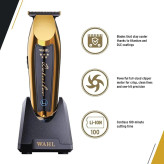 ماشین اصلاح سر و صورت وال خط زن 5 ستاره دیتیلر ال آی گلد Wahl 5 Star Cordless Detailer Li Gold Trimmer 8171-700 تیغه T-wide دارای پوشش های تیتانیوم و می باشد بنابراین تیغه ها خنک تر می مانند و در نتیجه در برابر خوردگی مقاوم هستند و بسیار قوی می باشد.تیغه T-wide قابل تنظیم (#2215-700) را می توان با فاصله صفر برای کوتاه کردن بسیار نزدیک به صفر استفاده کرد.وال دیتیلر گلد از یک موتور قیچی فوق قدرتمند و کامل برای اصلاح صاف انواع مو استفاده می شود که بیش از 100 دقیقه براتون کار مکیند و دارای باتری ال آیتیوم یونی با شارژ هوشمند LED است