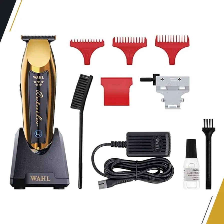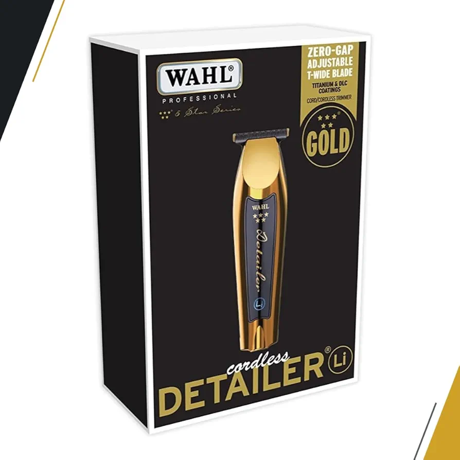 ماشین اصلاح سر و صورت وال خط زن 5 ستاره دیتیلر ال آی گلد Wahl 5 Star Cordless Detailer Li Gold Trimmer 8171-700 تیغه T-wide دارای پوشش های تیتانیوم و می باشد بنابراین تیغه ها خنک تر می مانند و در نتیجه در برابر خوردگی مقاوم هستند و بسیار قوی می باشد.تیغه T-wide قابل تنظیم (#2215-700) را می توان با فاصله صفر برای کوتاه کردن بسیار نزدیک به صفر استفاده کرد.وال دیتیلر گلد از یک موتور قیچی فوق قدرتمند و کامل برای اصلاح صاف انواع مو استفاده می شود که بیش از 100 دقیقه براتون کار مکیند و دارای باتری ال آیتیوم یونی با شارژ هوشمند LED است