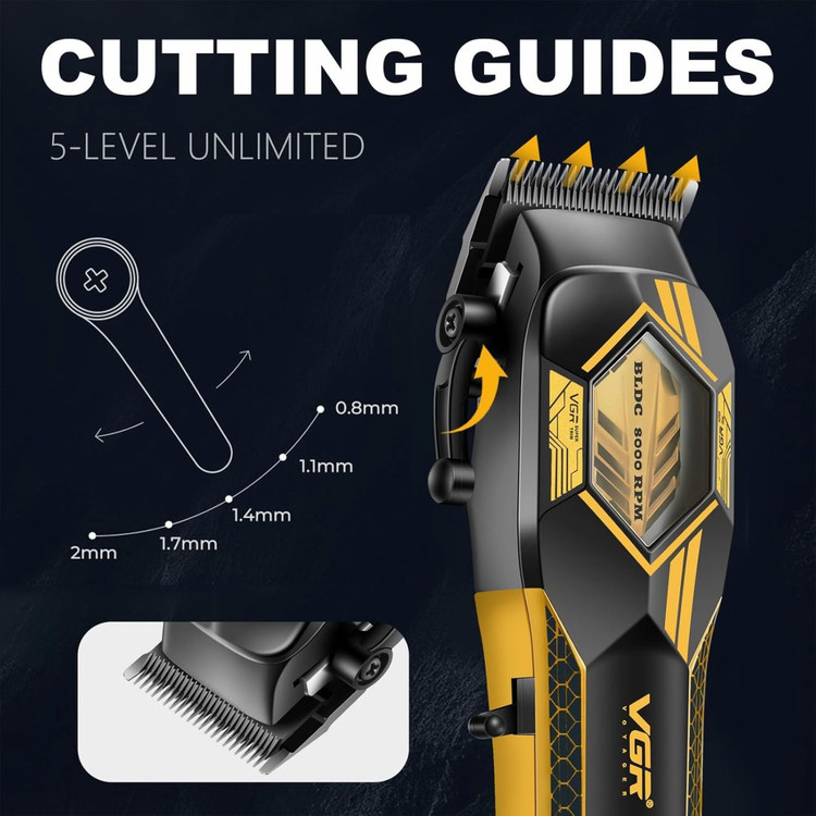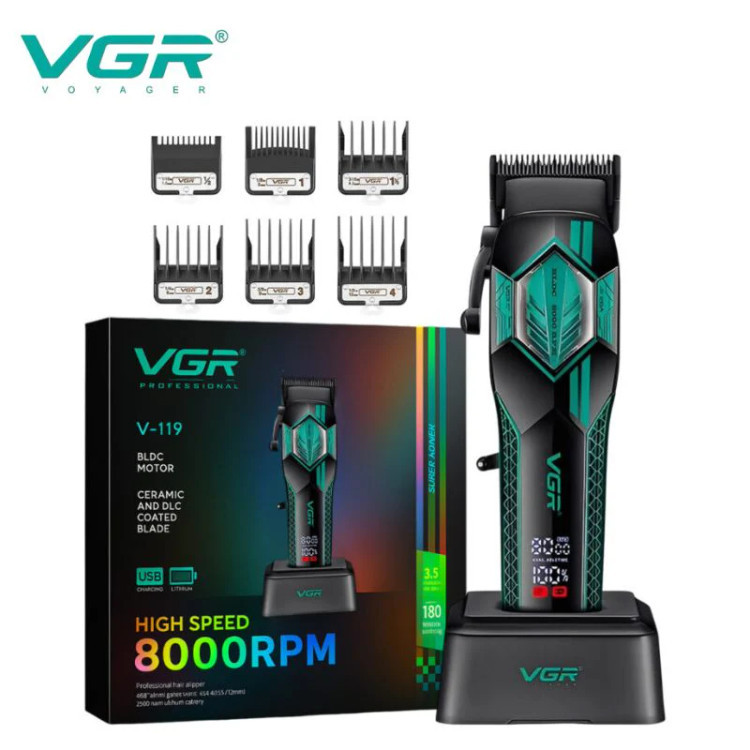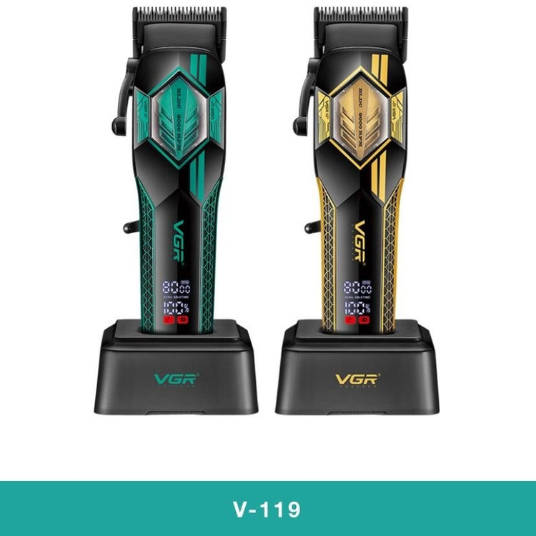 ماشین اصلاح حرفهای وی جی آر مدل V-119 با طراحی مدرن و موتور قدرتمند، انتخابی ایدهآل برای آرایشگران حرفهای و استفاده خانگی است. این دستگاه با ترکیب تیغههای سرامیکی پیشرفته و موتور BLDC پرسرعت، اصلاحی دقیق، روان و بدون آسیب به پوست ارائه میدهد.